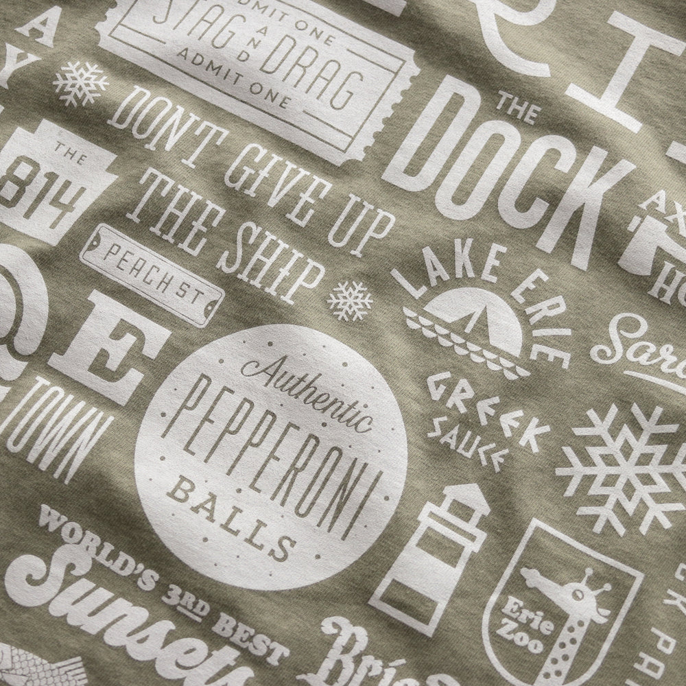 Our Erie Collage is the epitome of hometown pride. Words printed in a satisfyingly geometric pattern is a list of all things Erie.