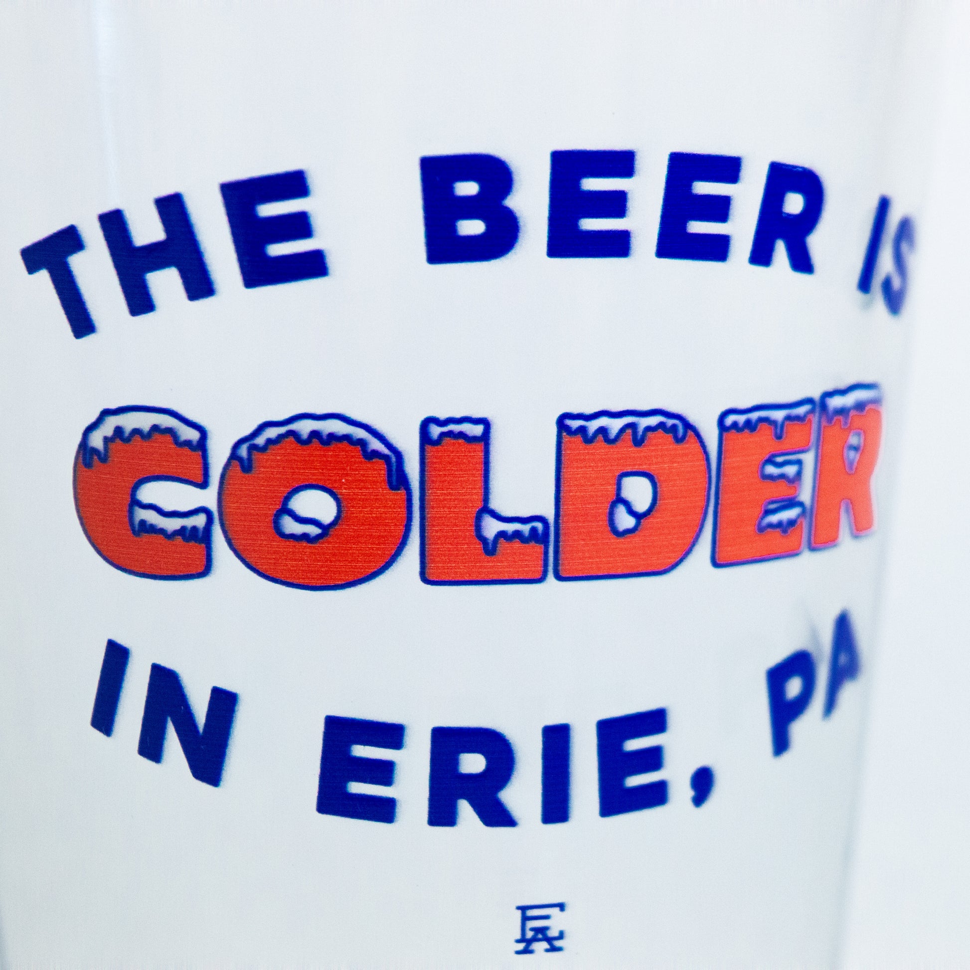 Erie claims about 133 frosty days each year! Naturally, no cooler necessary to keep your brews remarkably cold. Printed on a 16 oz pint glass.