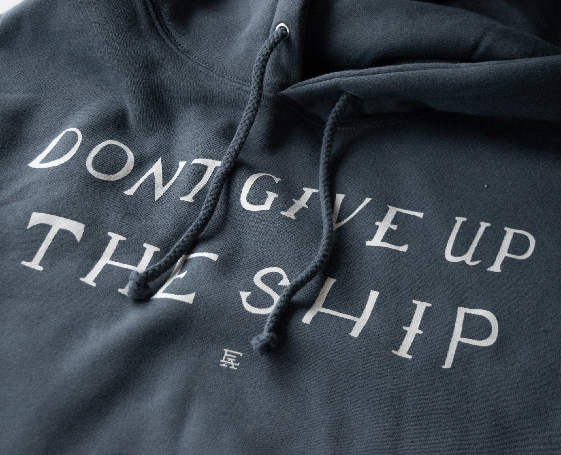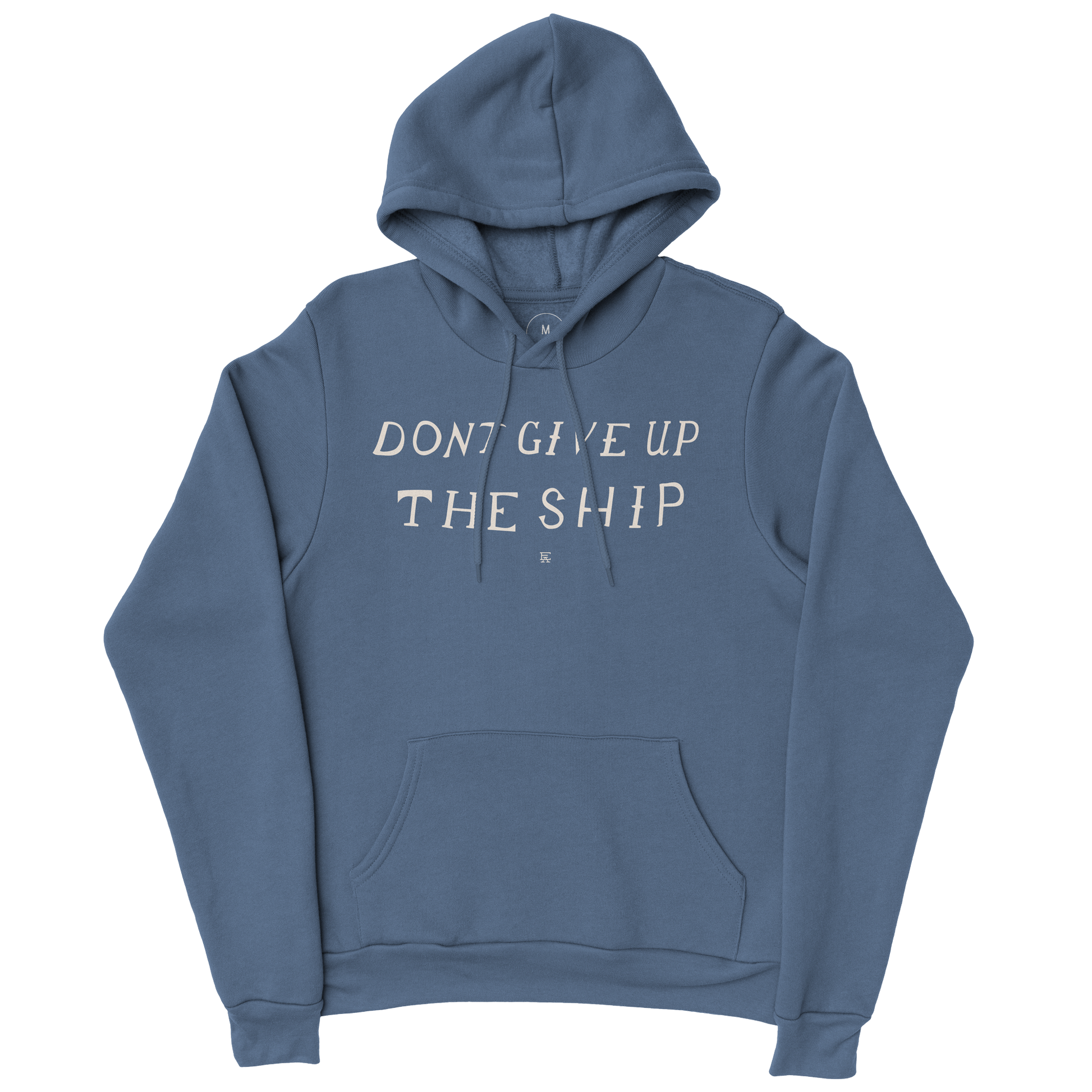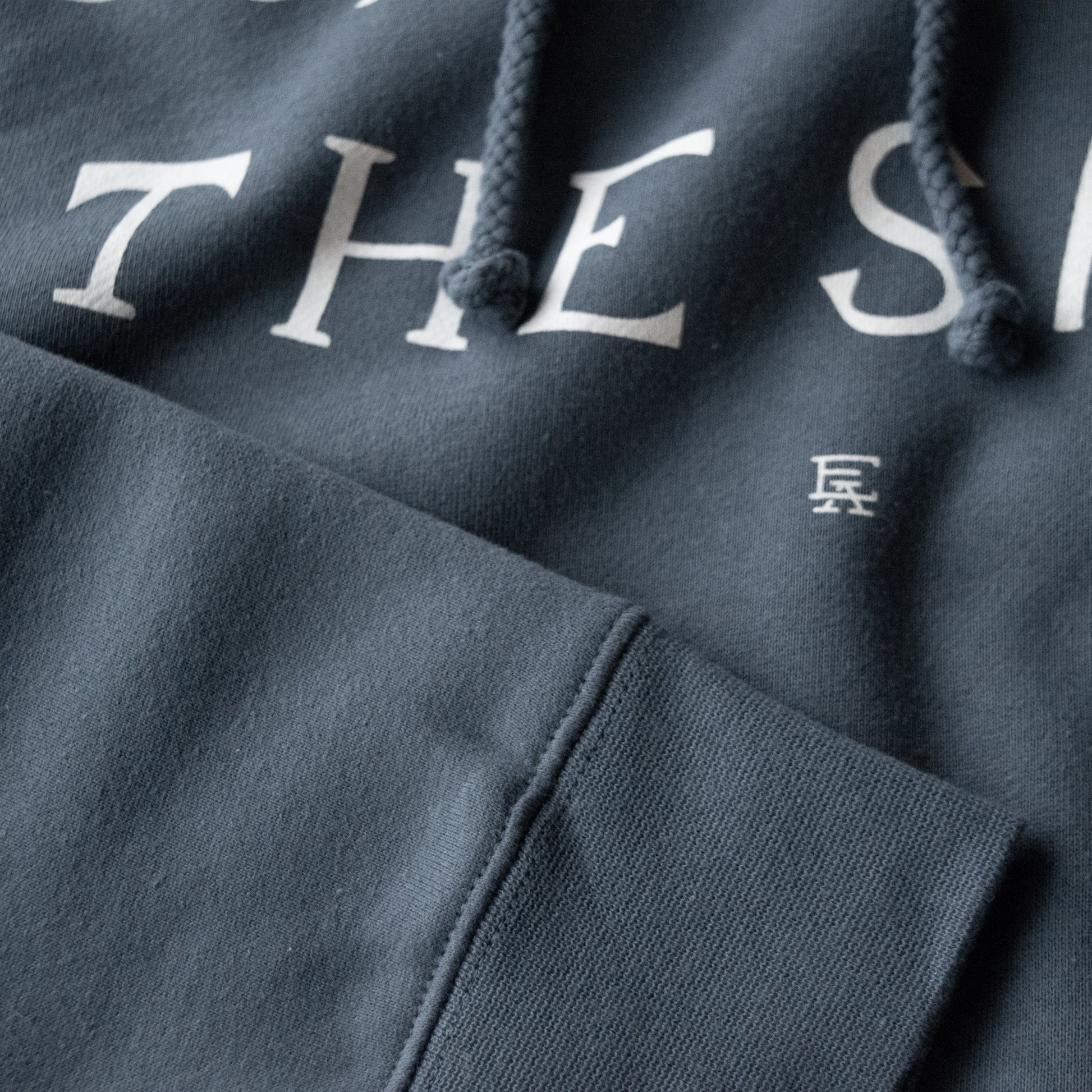 Printed on a premium 80/20 cotton/polyester blend hoodie in slate blue with white ink. Modern fitting.