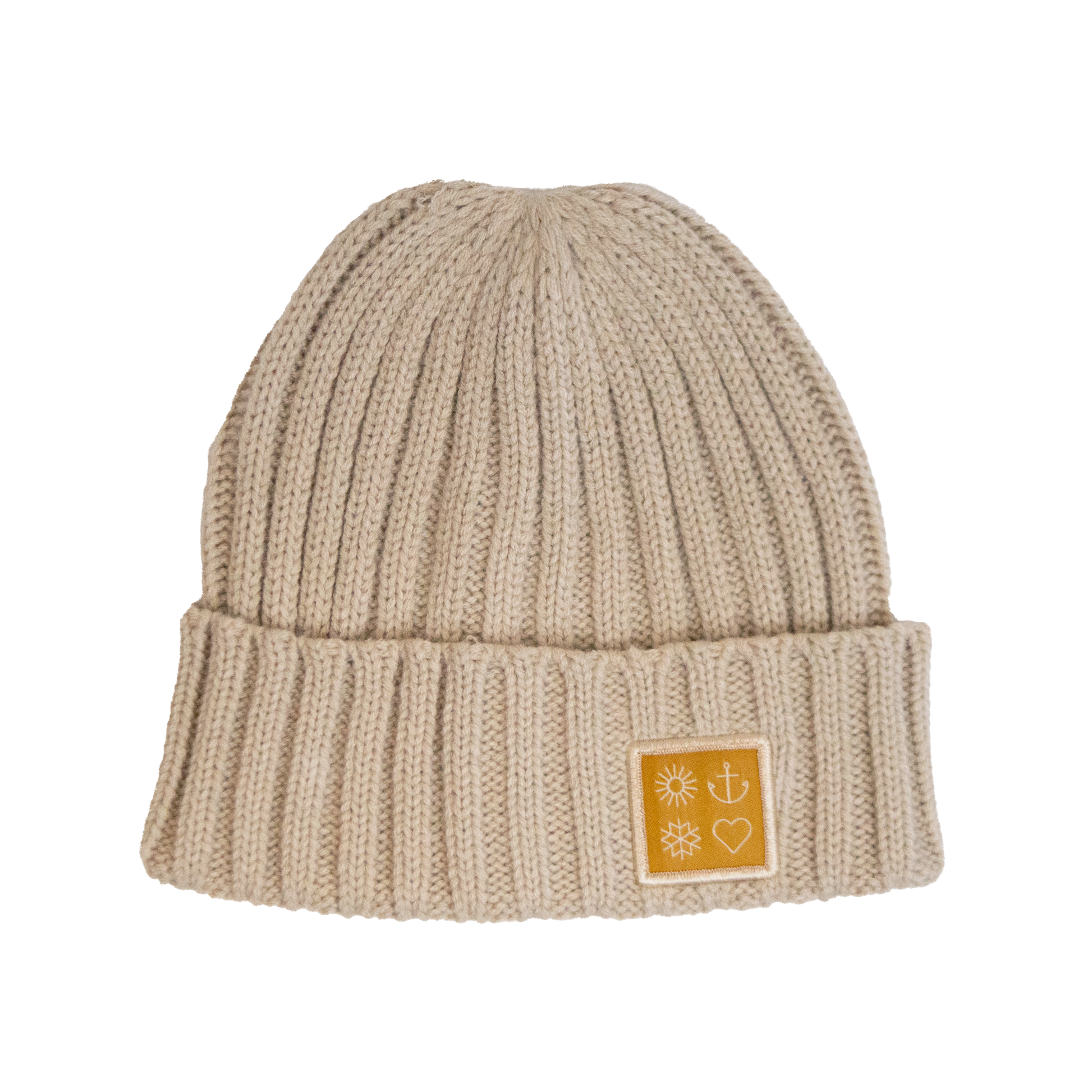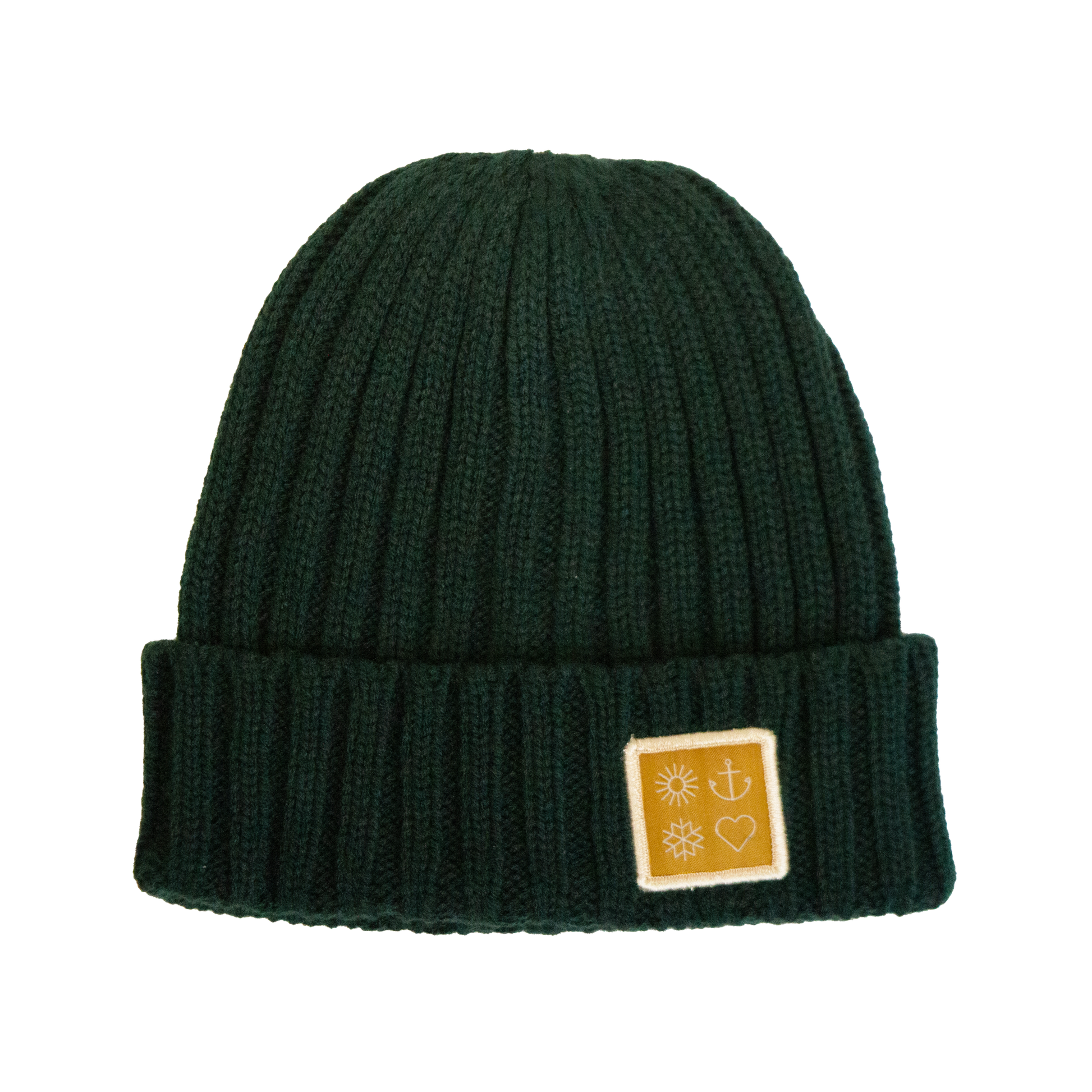 50/50 recycled polyester/acrylic. 11” cable knit with cuff. One size fits most.