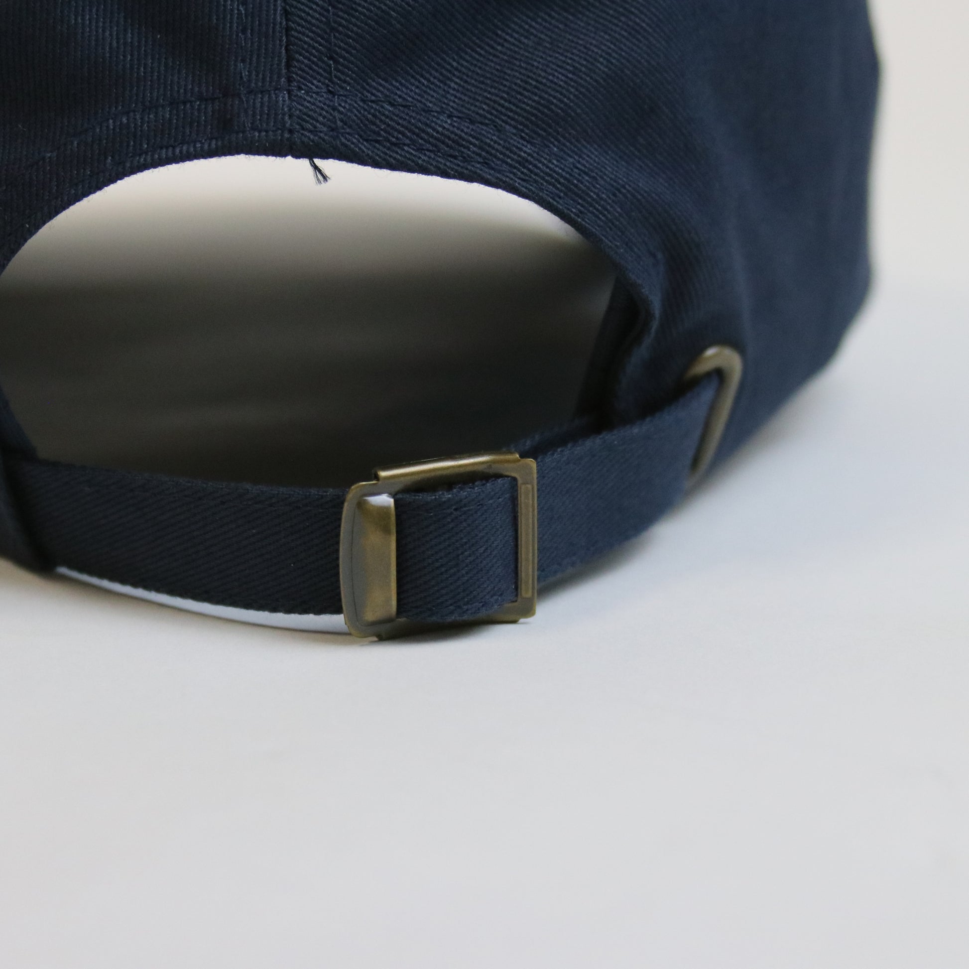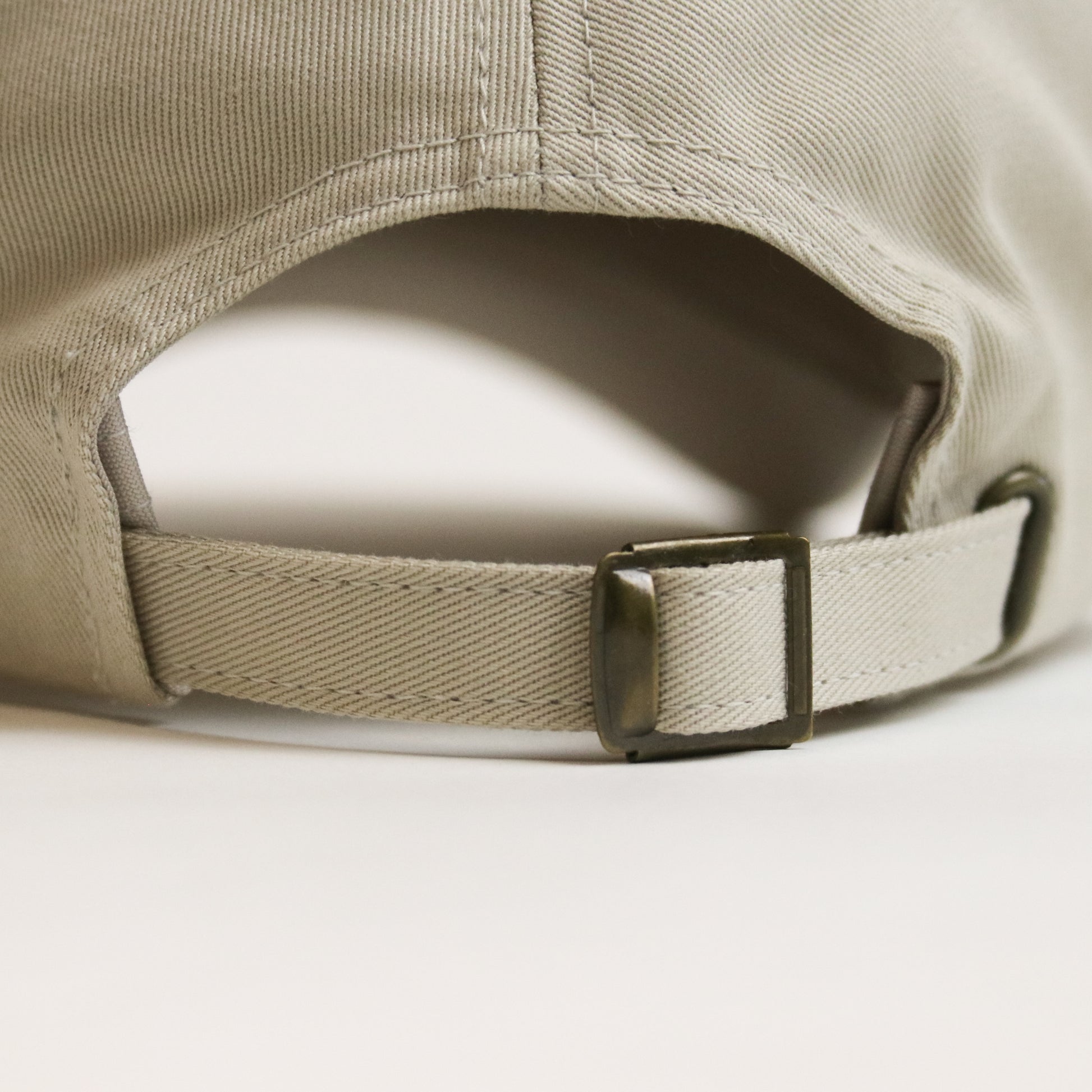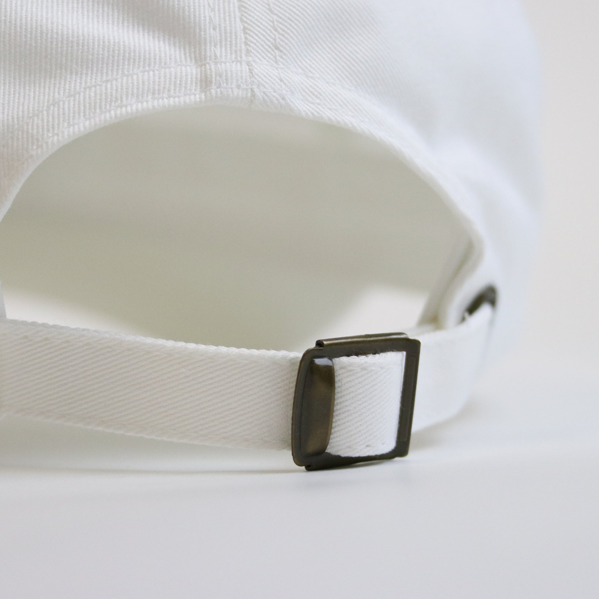 Adjustable 6-panel hat with a buckle closure at the back and an embroidered sunset design on the front.
