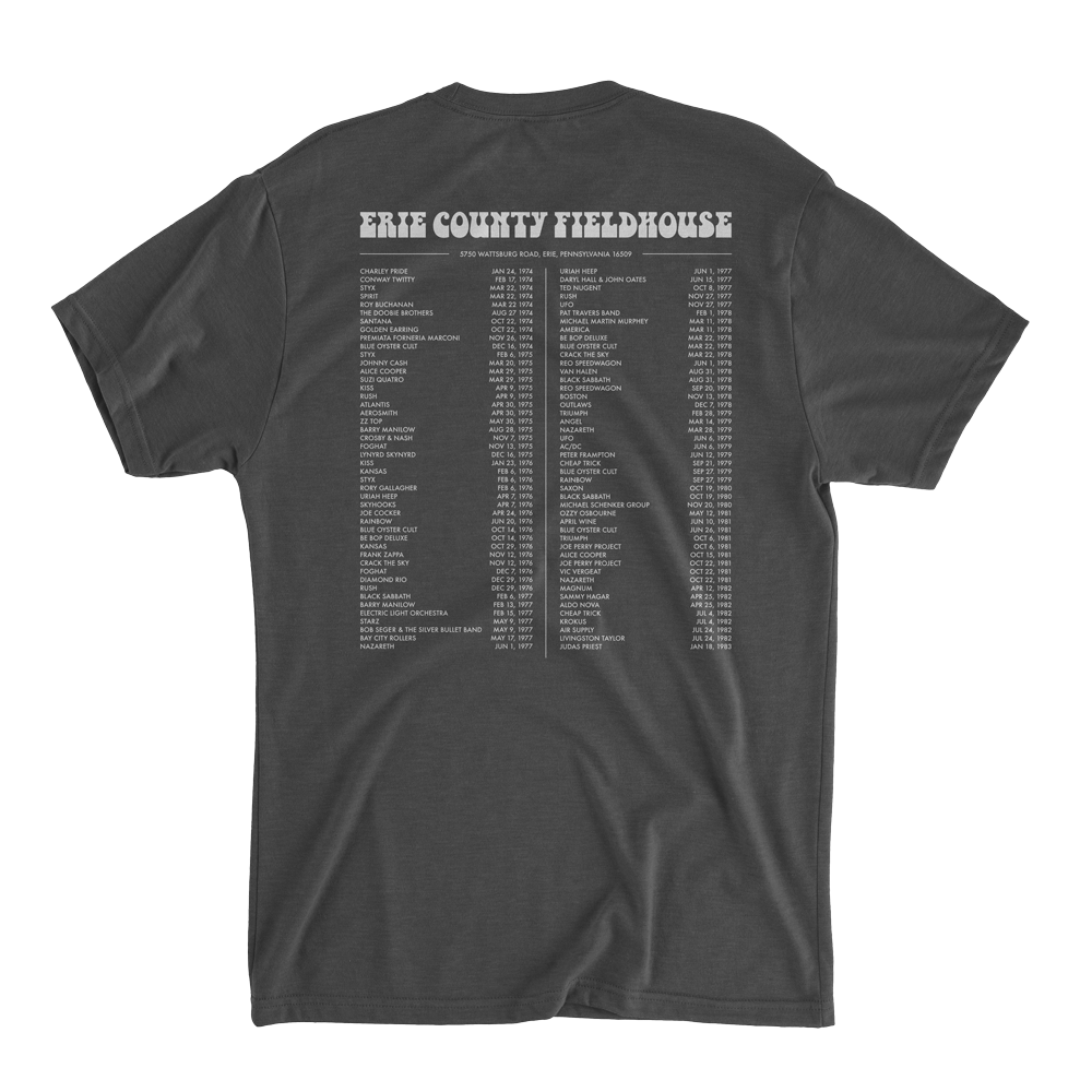 Erie County Fieldhouse was a concert venue/arena at the height of its popularity in the late-70's to early 80's. It was home to the Erie Blades and hosted many famous artists who would come through Erie as a stop on their tours between Buffalo and Cleveland. Journey, Kiss, ACDC, Rush, Van Halen, and Aerosmith are some of the famous acts that played there. The back of the shirt is filled with concert dates of some of their more popular shows hosted there.