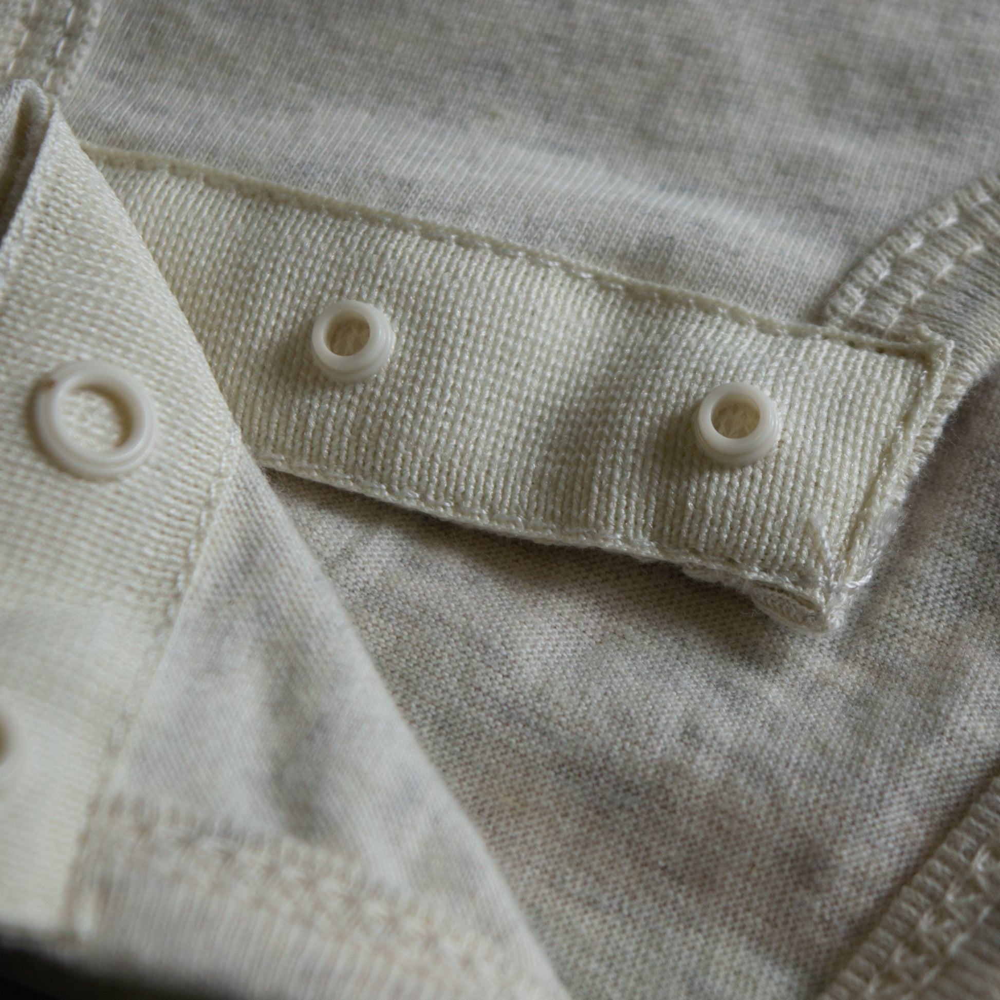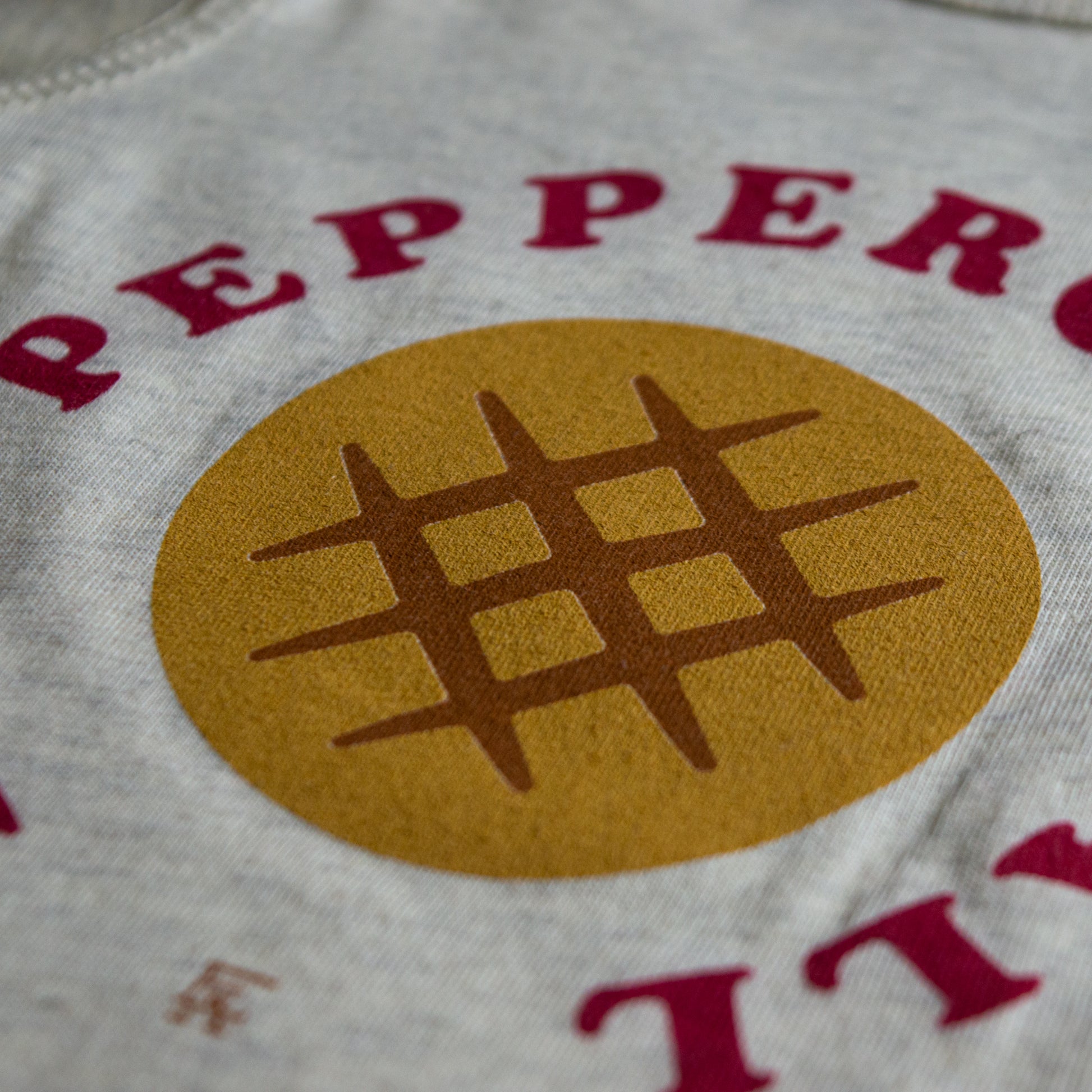 Printed on a 60/40 blend heather grey onesie with red and tan ink. Modern fitting.